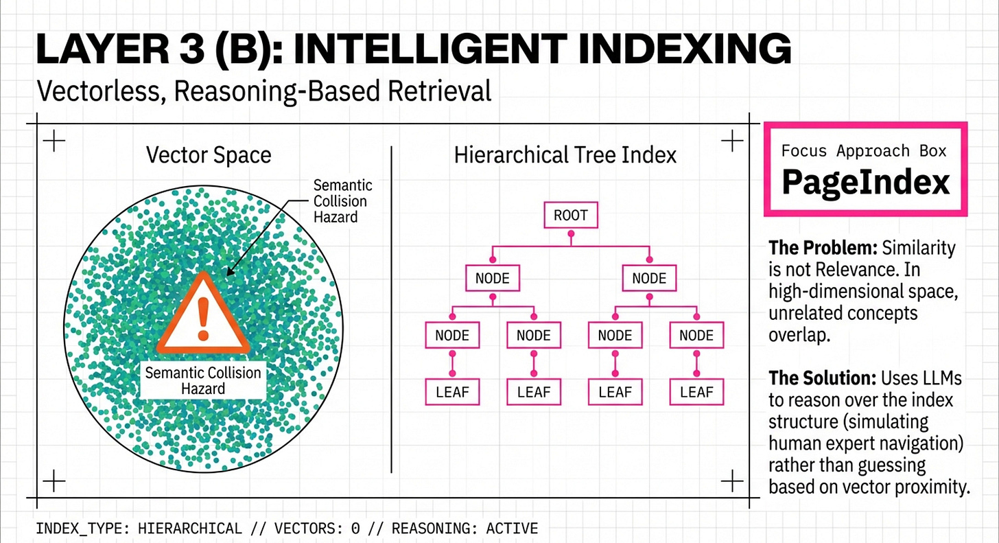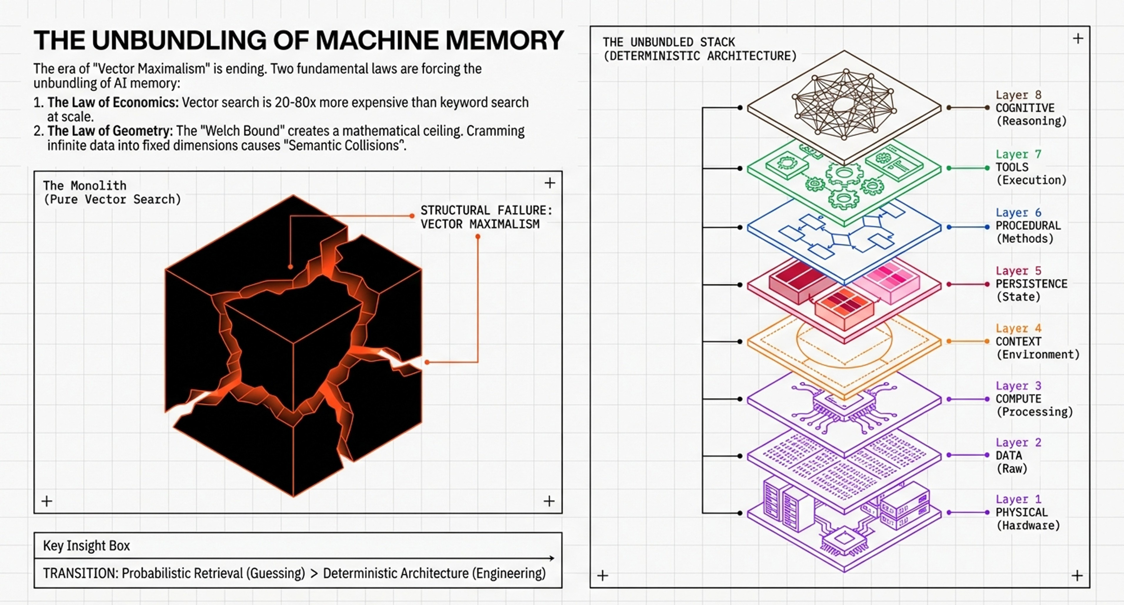 This representation focuses on the functional evolution of agent intelligence and the transition away from monolithic “Vector Search”. You will observe a “broken cube” metaphor, representing the collapse of “Vector Maximalism” under the pressure of two fundamental laws: the Law of Economics (costs) and the Law of Geometry (precision limits/Welch Bound). Unlike the pyramid focus on silicon, this view emphasizes the Information Architecture (Layers 2-7), showing how tools like PageIndex and the Git Context Controller (GCC) “unbundle” memory into structured, navigable, and versioned artifacts. This is the strategic view for those looking to move AI from “probabilistic guessing” to “deterministic engineering,” ensuring that an agent can manage its own memory through CRUD operations (Create, Read, Update, Delete) without suffering from “context rot”.