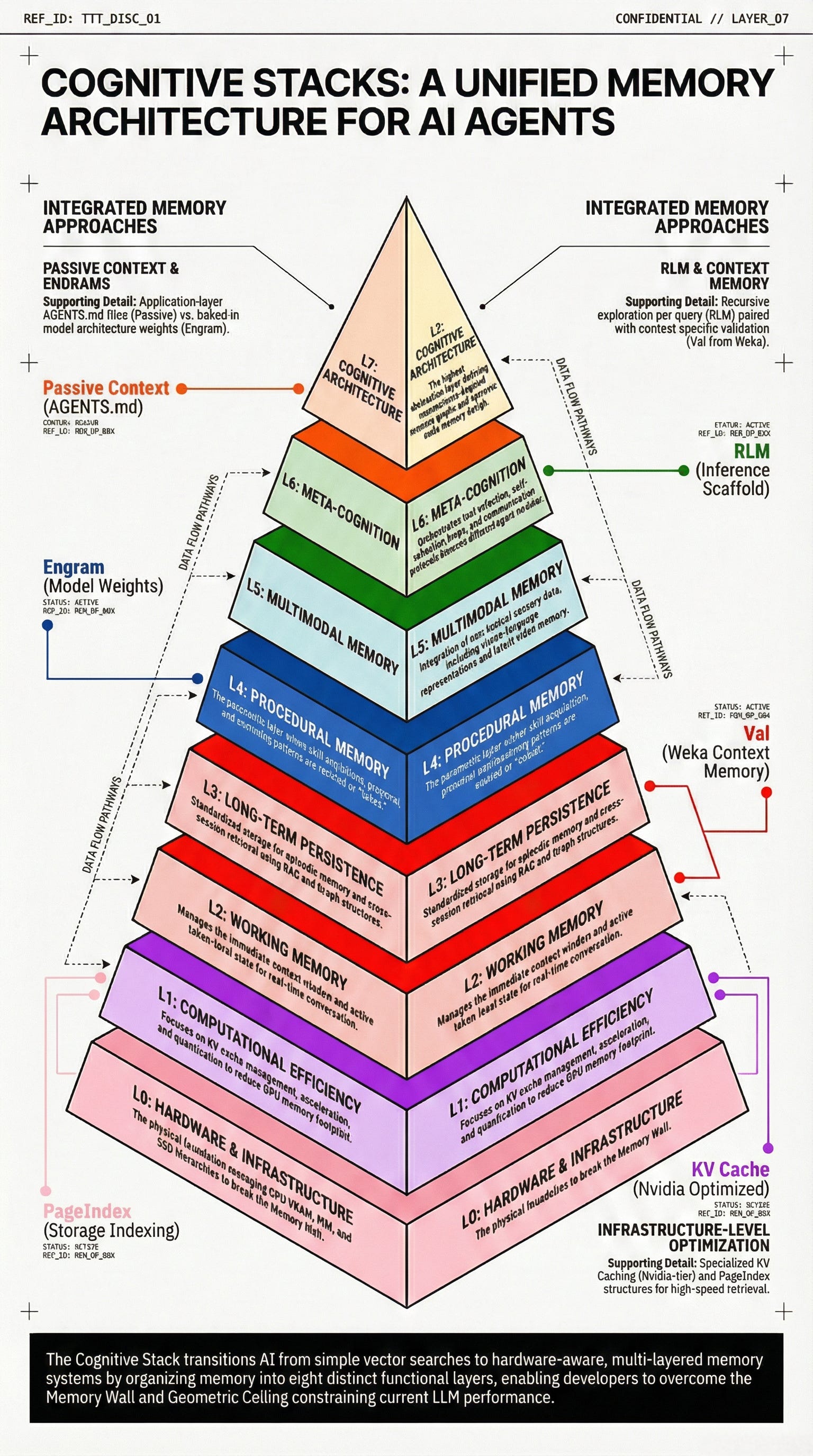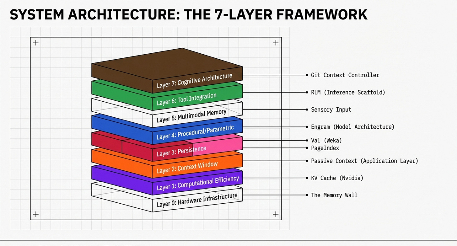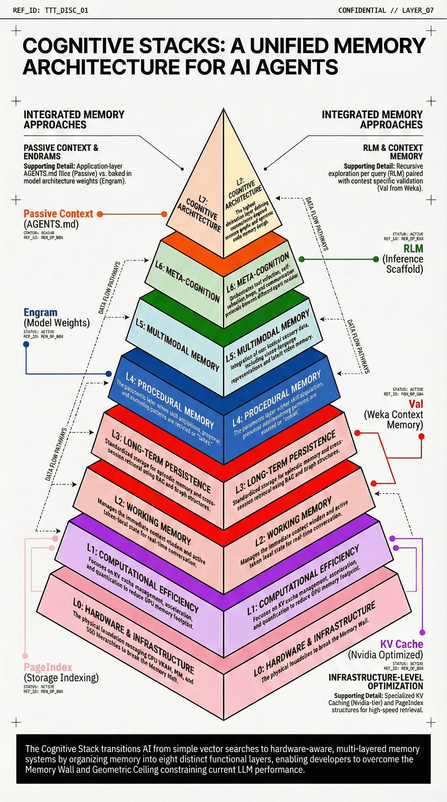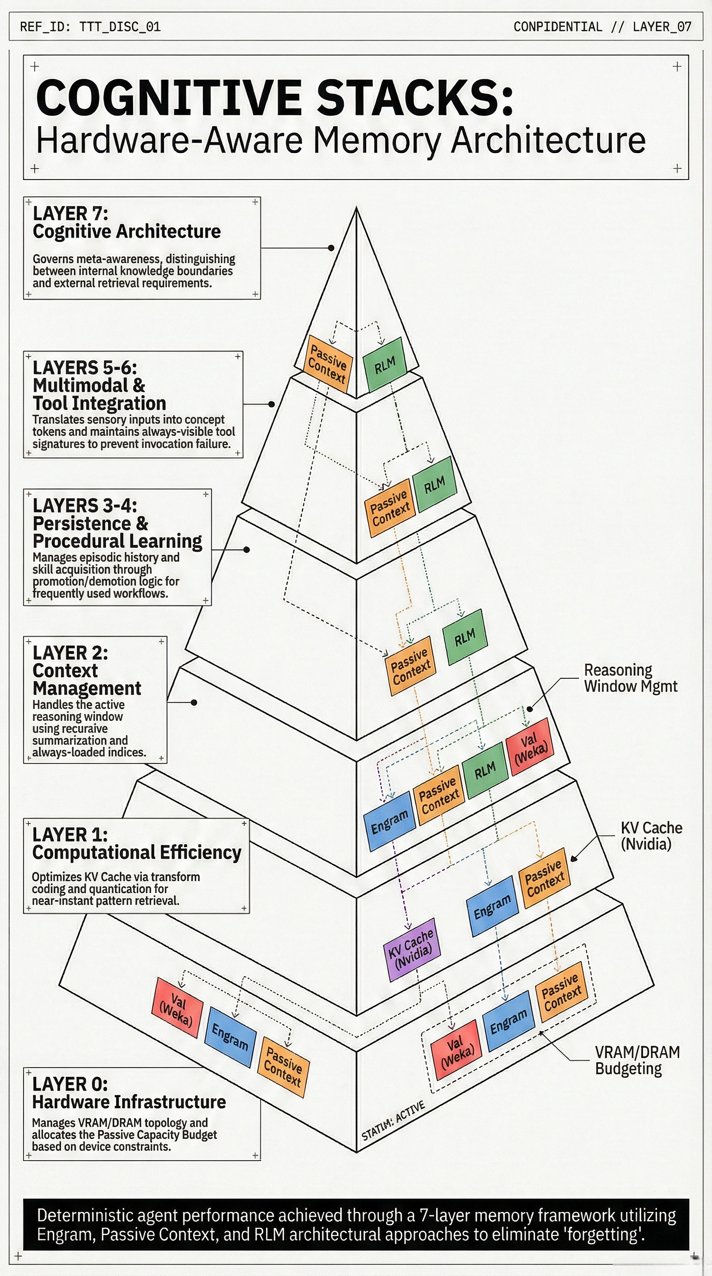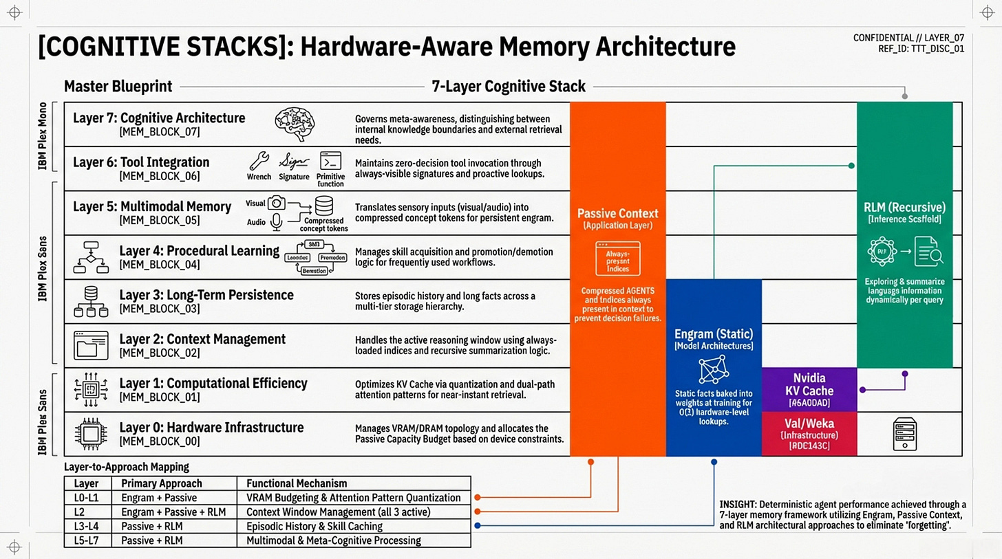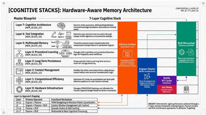 You will see a bottom-up pyramid that anchors AI reasoning directly into physical silicon. This infographic focuses on the “Physical Scaffold” of the memory wall, illustrating how high-level cognitive functions are literally supported by Layer 0 (Hardware Infrastructure) and Layer 1 (Computational Efficiency). The slight difference in this representation is its emphasis on capacity budgeting—mapping techniques like Nvidia KV Cache compression and Weka’s tiered storage directly onto VRAM and DRAM limits. It presents a synthesis where “Passive Context” and “Recursive Language Models” (RLMs) are not just software tricks, but strategic allocations of a device’s physical memory budget. This is the view for those who need to understand how to bypass the “PCIe tax” and hardware bottlenecks to make 24/7 agents a physical reality: