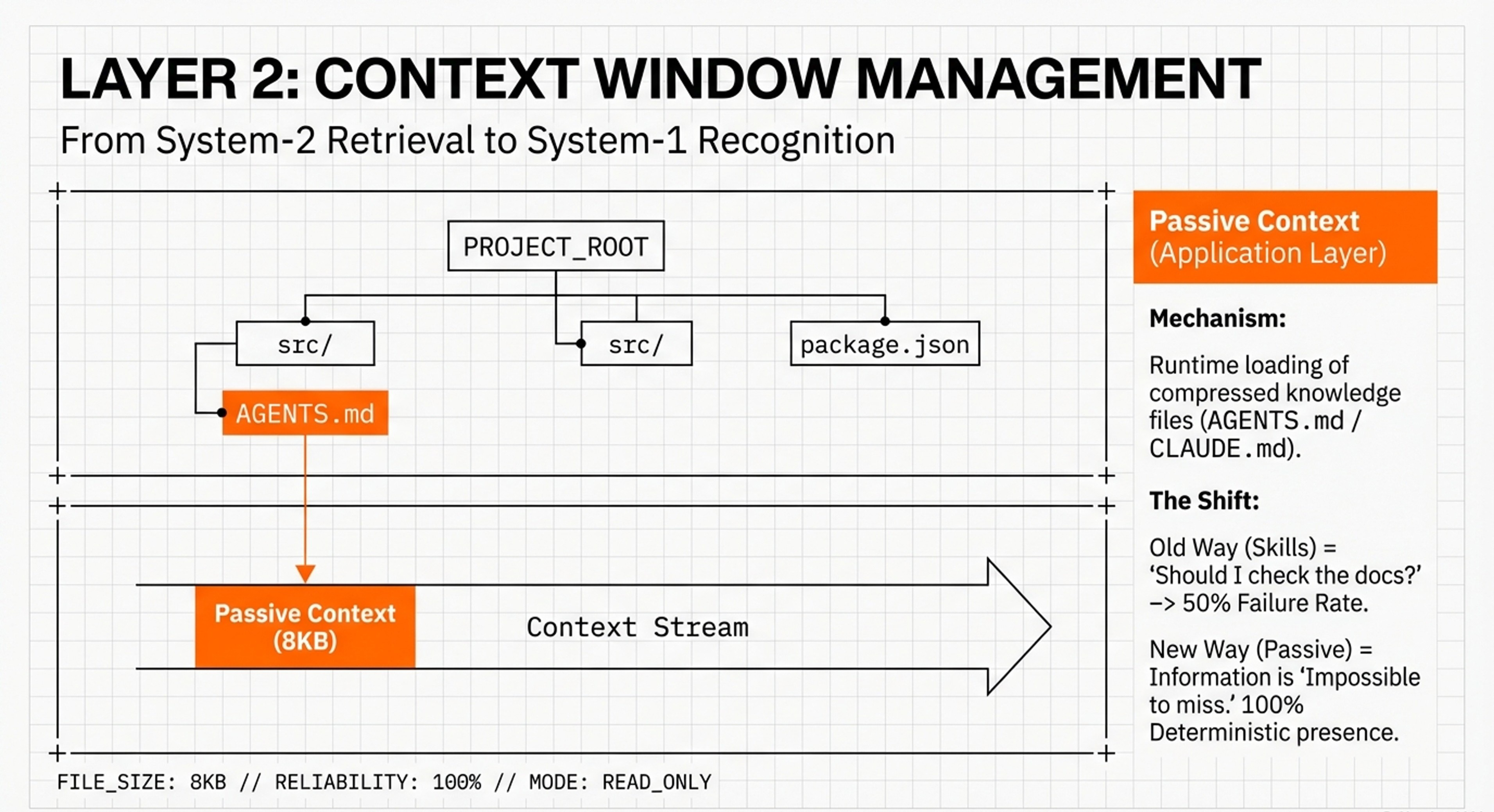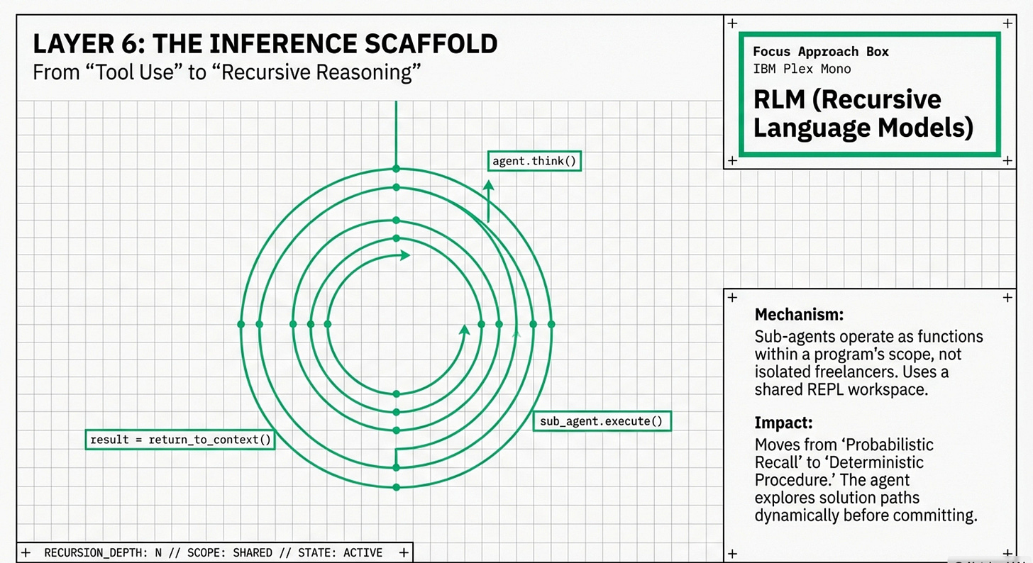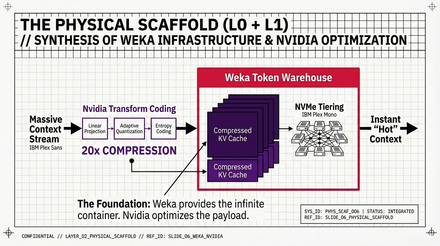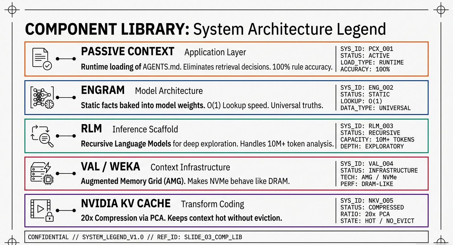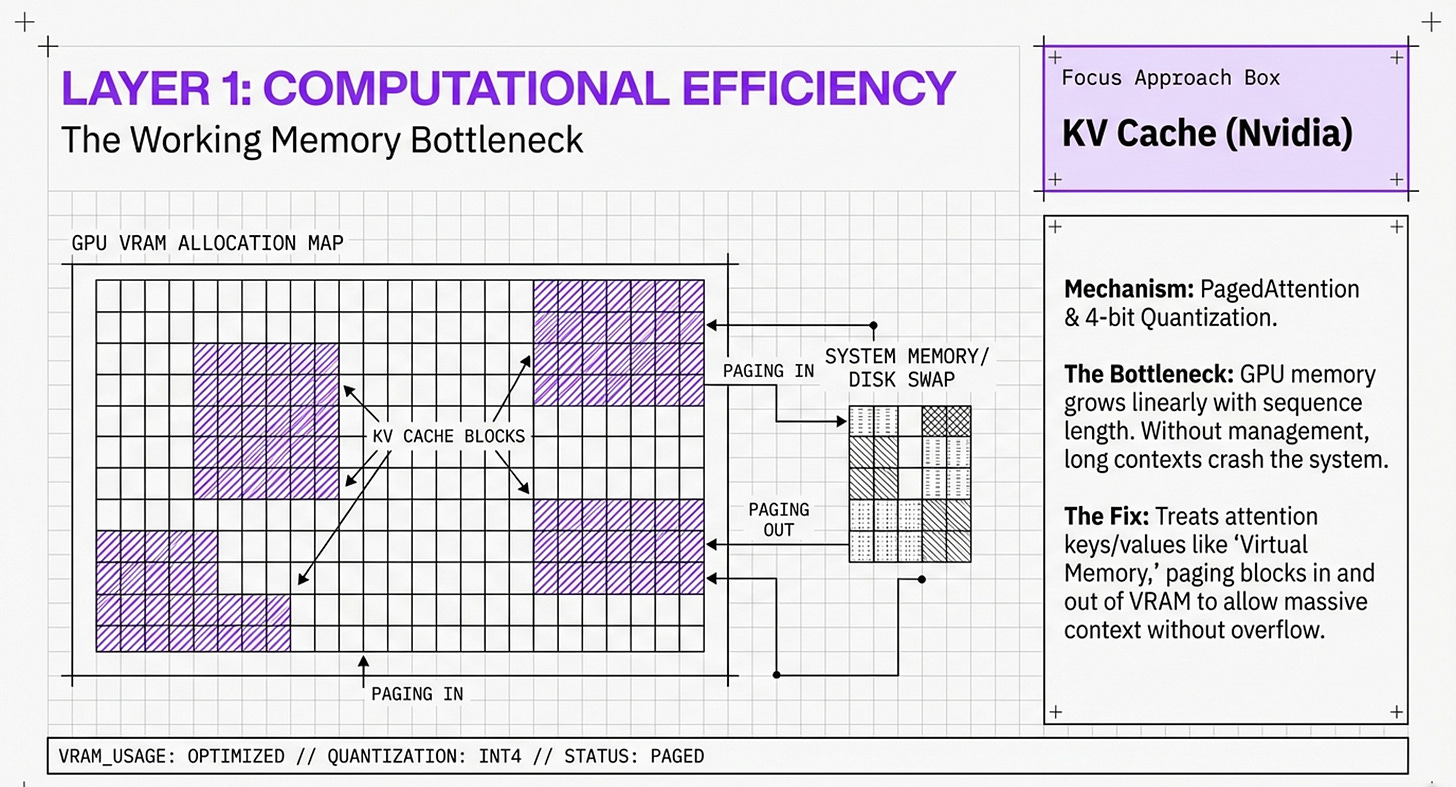 You will see a bottom-up pyramid that anchors AI reasoning directly into physical silicon. This infographic focuses on the “Physical Scaffold” of the memory wall, illustrating how high-level cognitive functions are literally supported by Layer 0 (Hardware Infrastructure) and Layer 1 (Computational Efficiency). The slight difference in this representation is its emphasis on capacity budgeting—mapping techniques like Nvidia KV Cache compression and Weka’s tiered storage directly onto VRAM and DRAM limits. It presents a synthesis where “Passive Context” and “Recursive Language Models” (RLMs) are not just software tricks, but strategic allocations of a device’s physical memory budget. This is the view for those who need to understand how to bypass the “PCIe tax” and hardware bottlenecks to make 24/7 agents a physical reality: