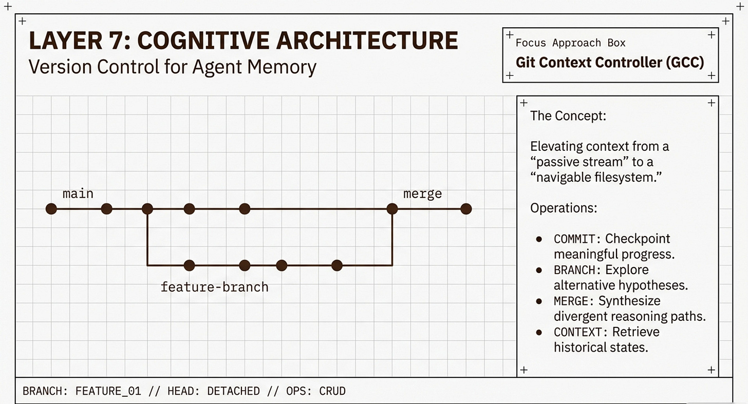 • 2 explains the orchestration: It shows how the software manages the information (e.g., how GCC elevates context into a “navigable filesystem” at the top of the stack