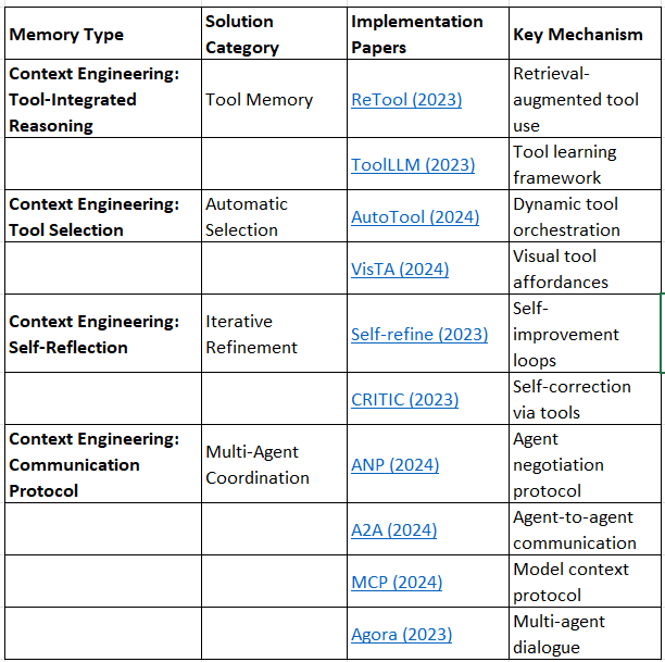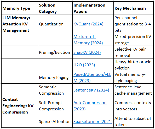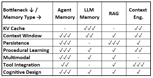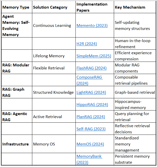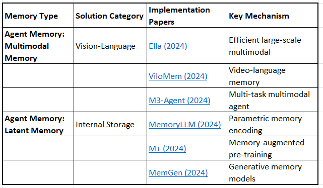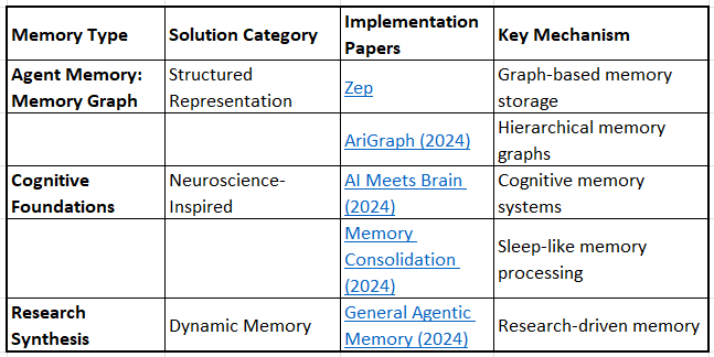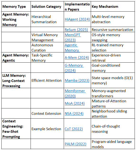 This framework integrates memory architectures (what types exist) with bottleneck solutions (what problems they solve), creating a comprehensive map of the research landscape.