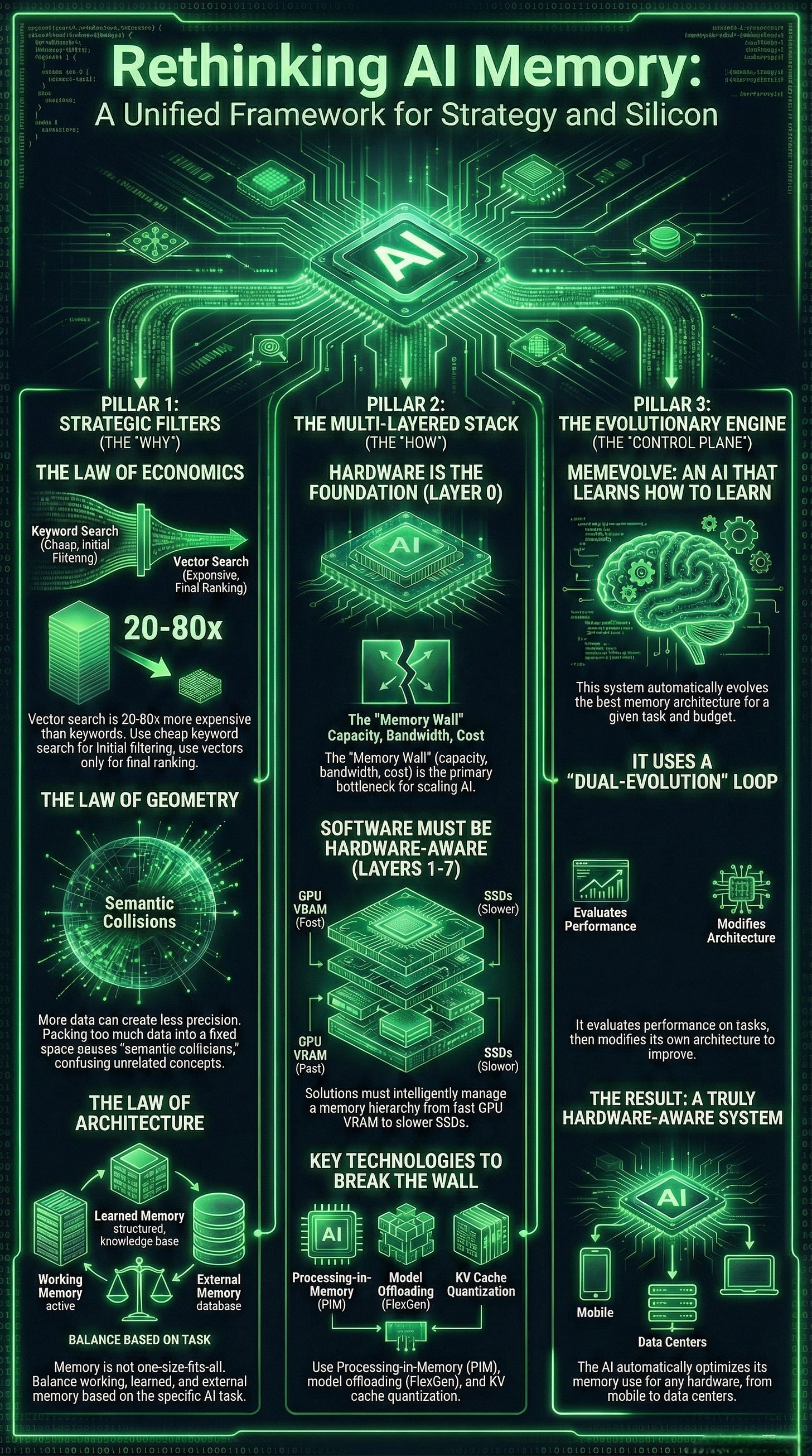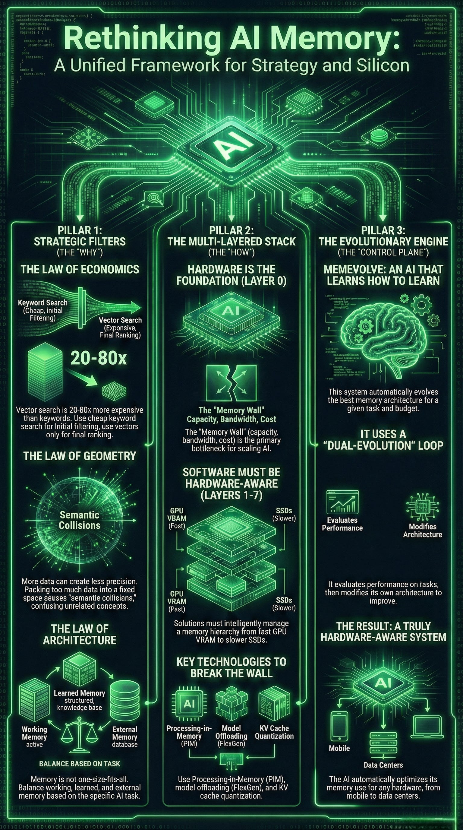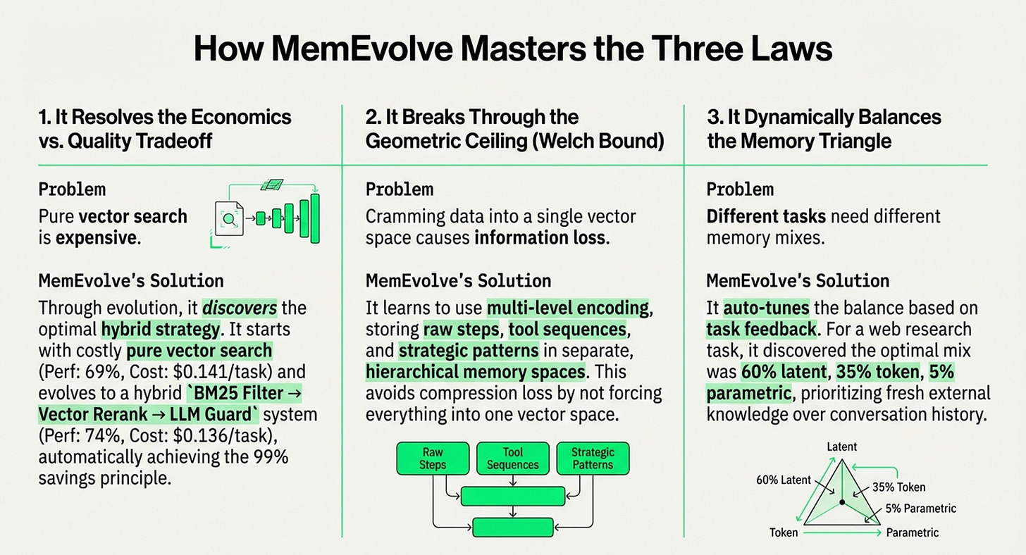 Combined, both explore the evolution of AI memory architectures, moving beyond the initial "vector gold rush" toward more hardware-aware and adaptive systems. They establish fundamental economic, geometric, and architectural laws that highlight the high costs and mathematical limitations of traditional vector searches. To address these constraints, I had highlighted and introduced MemEvolve, a meta-evolutionary engine that automates the design of memory modules by learning from performance failures.