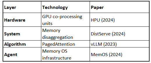 Unified benchmarking and standards. This unified framework shows that memory bottlenecks require solutions across all layers—from hardware optimization to cognitive architecture design. The most promising recent work (2025) focuses on unified systems that integrate multiple memory types to solve problems holistically rather than in isolation.