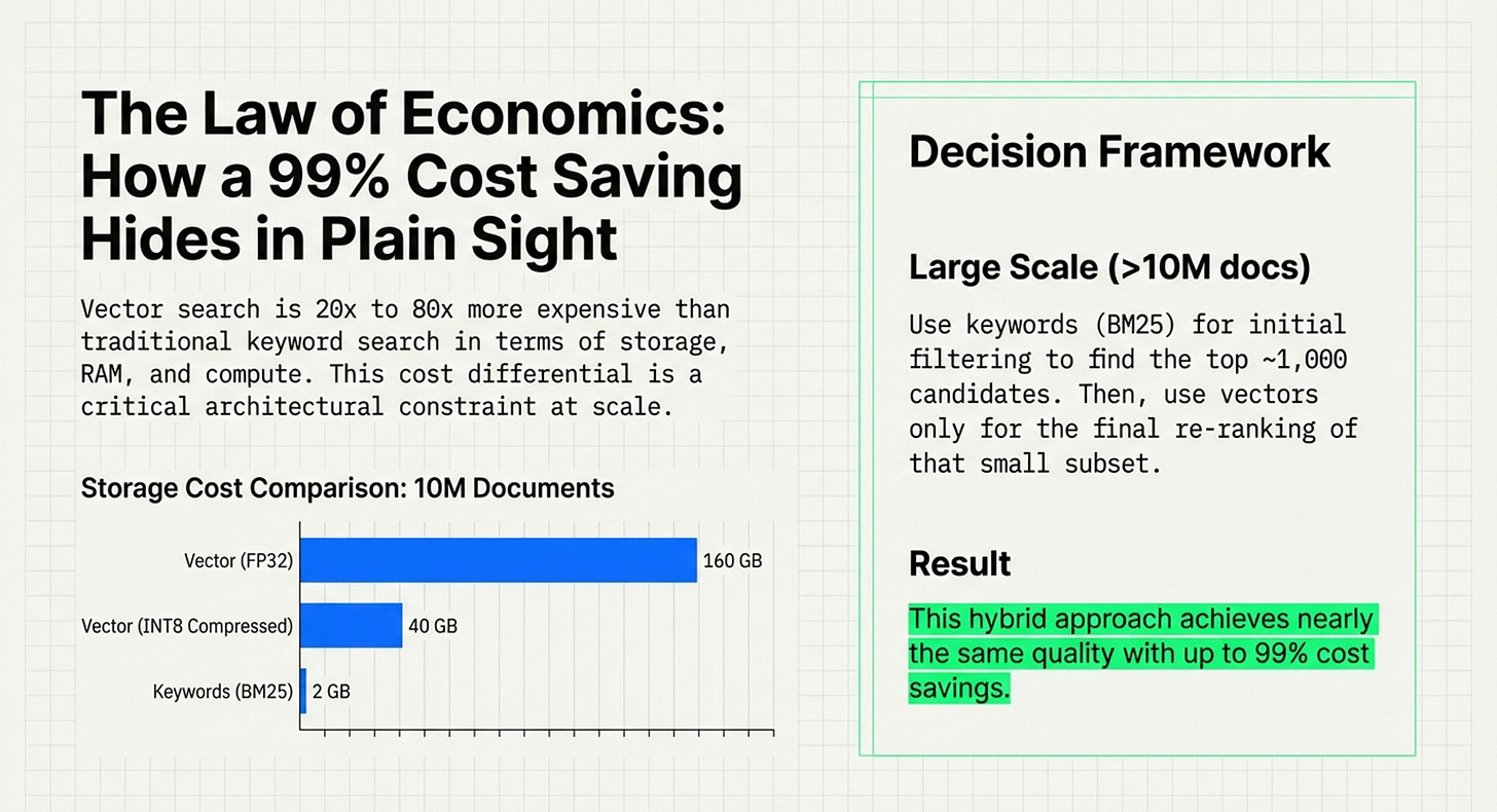 Economic Realism: It highlights a 20-80x cost difference between vector search and traditional keyword search (BM25), arguing for a “BM25 Renaissance” in large-scale systems.