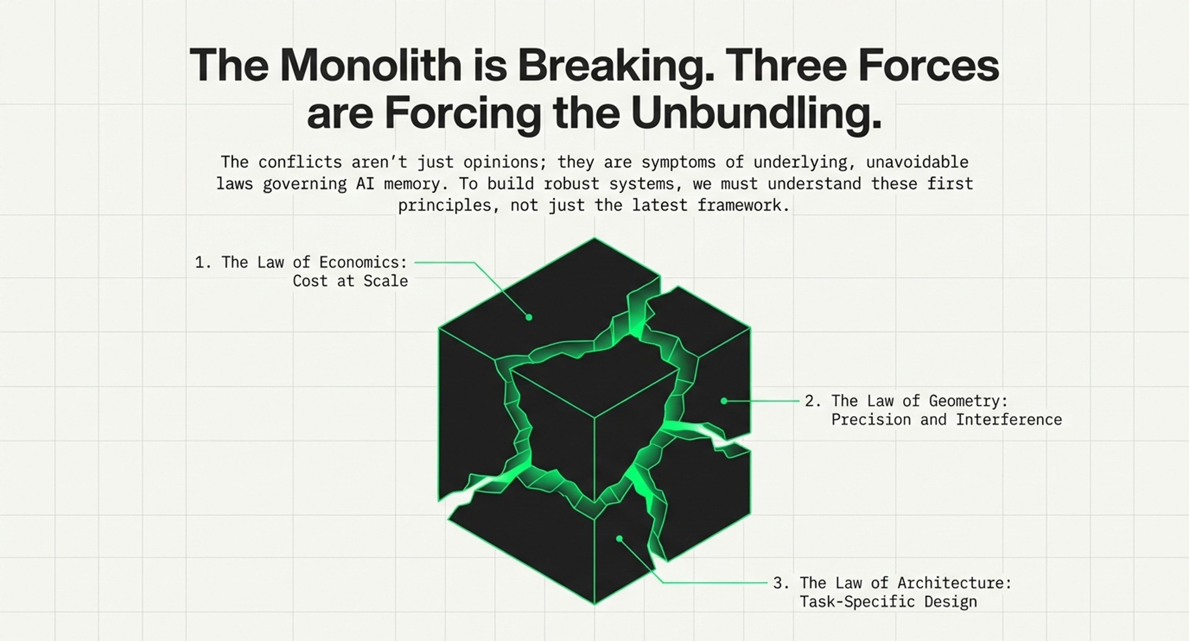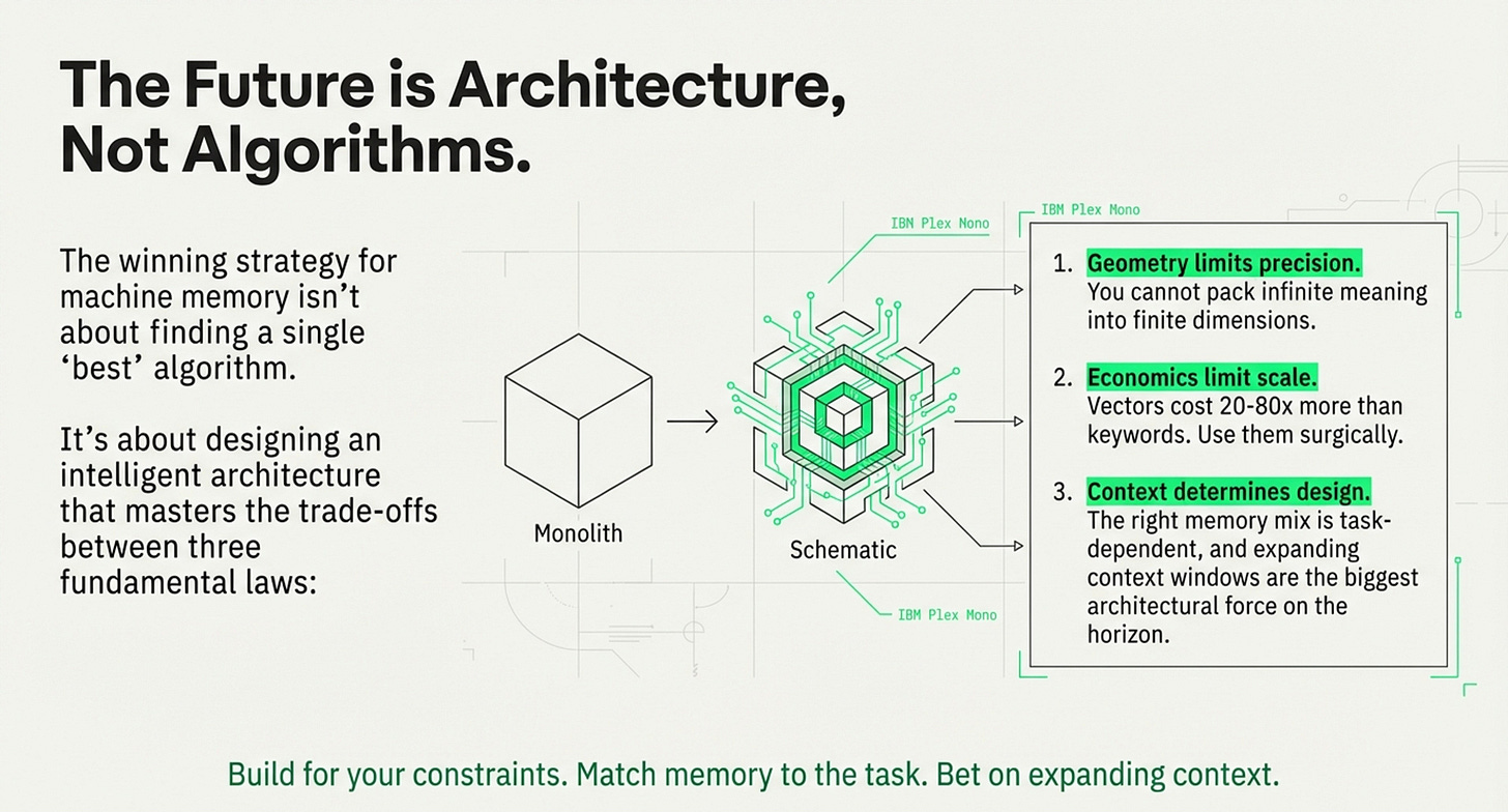 Strategic Focus: This article is oriented toward decision-making frameworks. It outlines five specific frameworks (Vector Economics, Welch Bound, Memory Triangle, Continuous Retrieval, and Context Maximalism) to help developers and planners guide choices of the right architecture for their specific constraints and timelines.