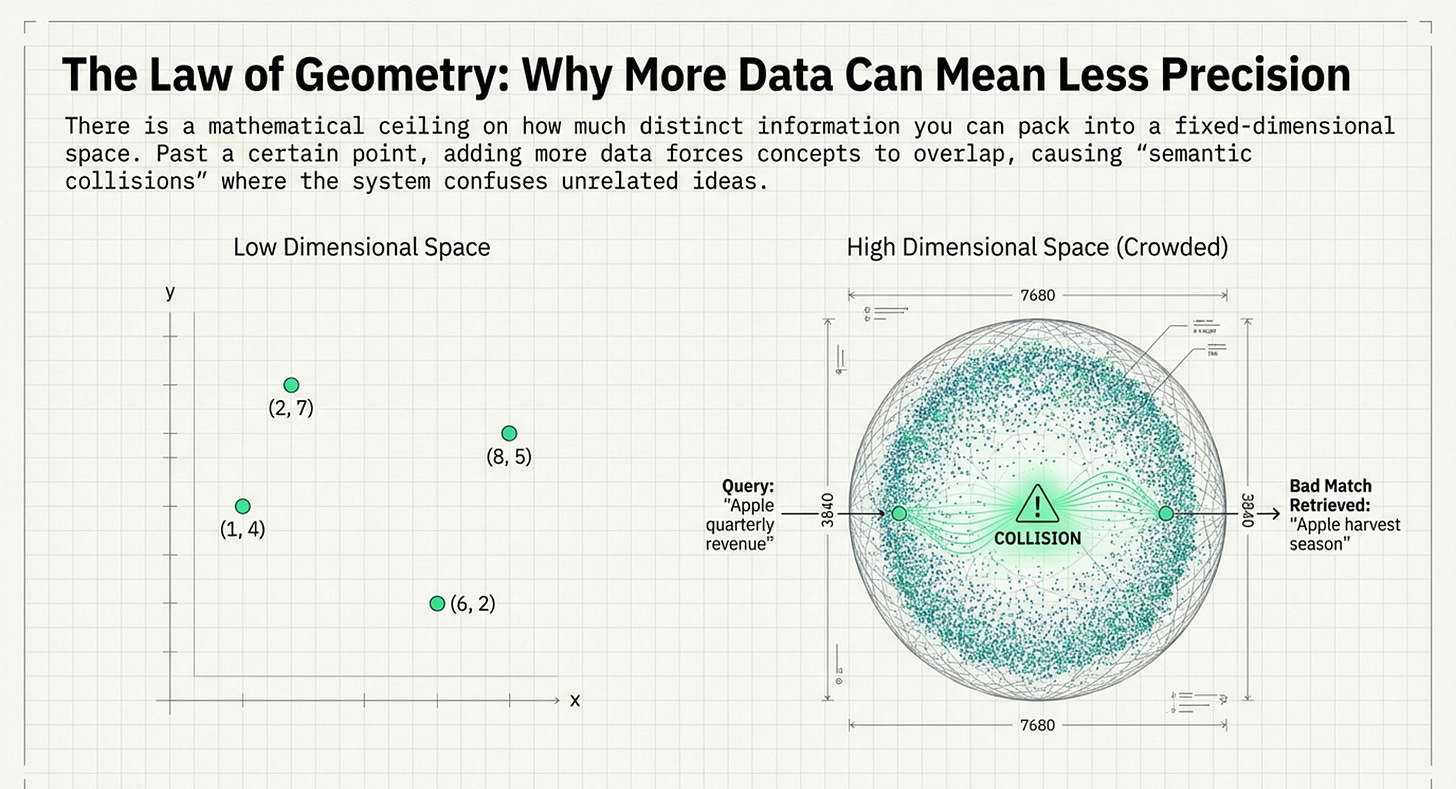 Mathematical Limits: It emphasizes the “geometric ceiling” of vector spaces, specifically citing the Welch Bound, which explains why cramming too much data into a fixed vector space leads to “semantic collisions” and reduced precision.