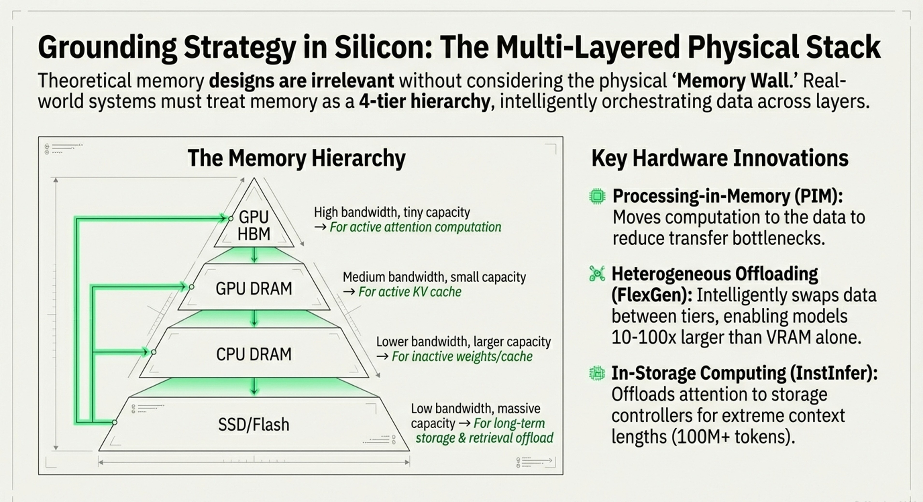 Hardware Bottlenecks: It dives deeply into the “Memory Wall,” discussing GPU VRAM capacity, bandwidth limitations, and the necessity of “Processing-in-Memory” (PIM) and “In-Storage Computing”.