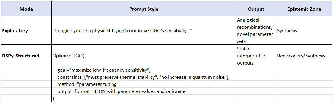 The exploratory prompt may yield surprising insights—like borrowing damping models from seismology. The DSPy prompt ensures consistency but may miss analogical leaps.