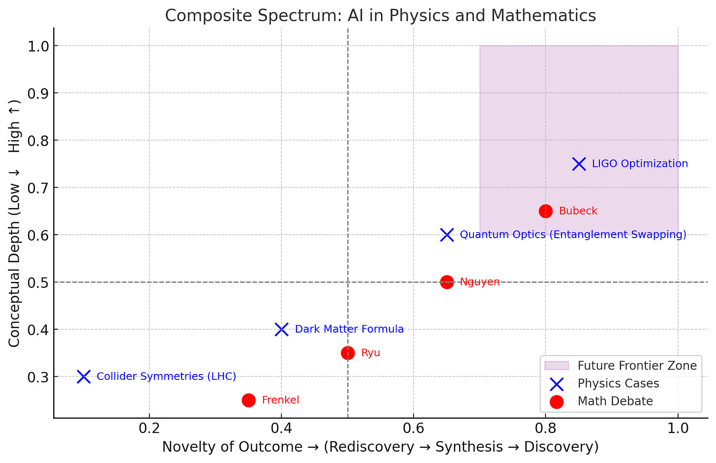 In my previous post - When AI Proves Theorems and Tunes Detectors, we traced how AI contributions to physics and mathematics fall along a spectrum—from rediscovery to synthesis to the elusive frontier of discovery.