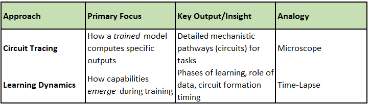 These approaches are complementary: Learning dynamics shows when certain structures might form, while circuit tracing examines how those structures operate in a mature model.