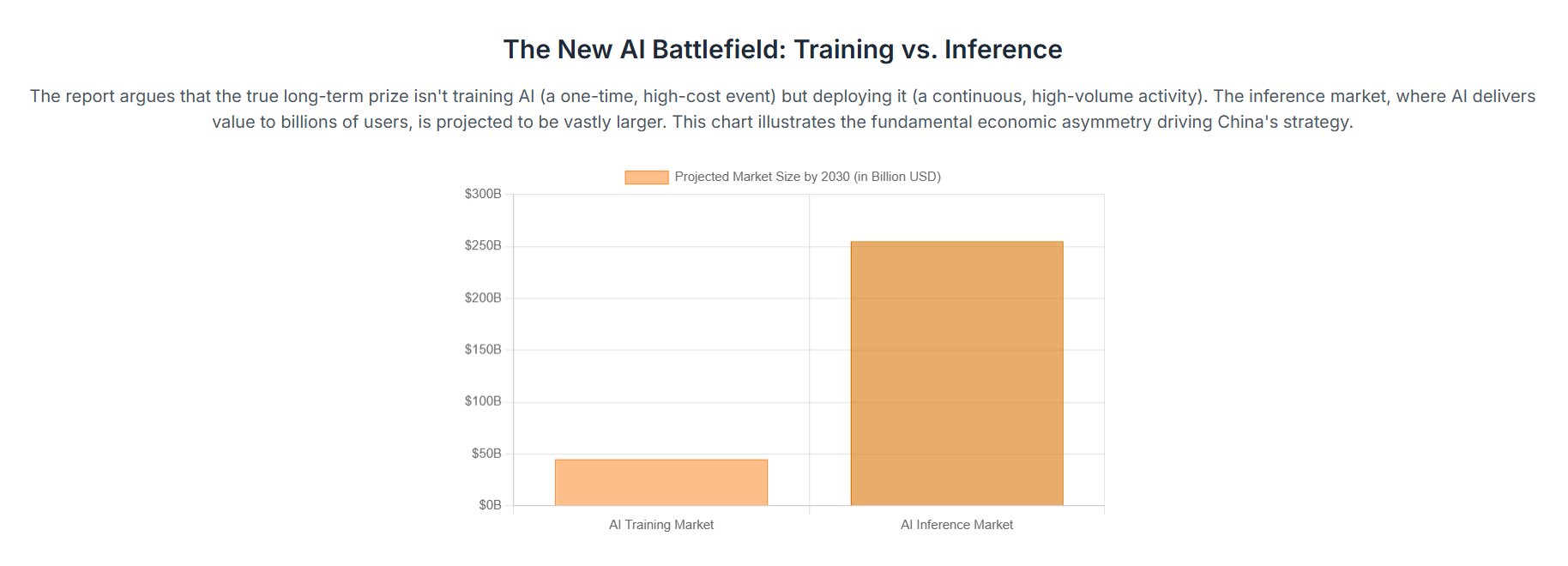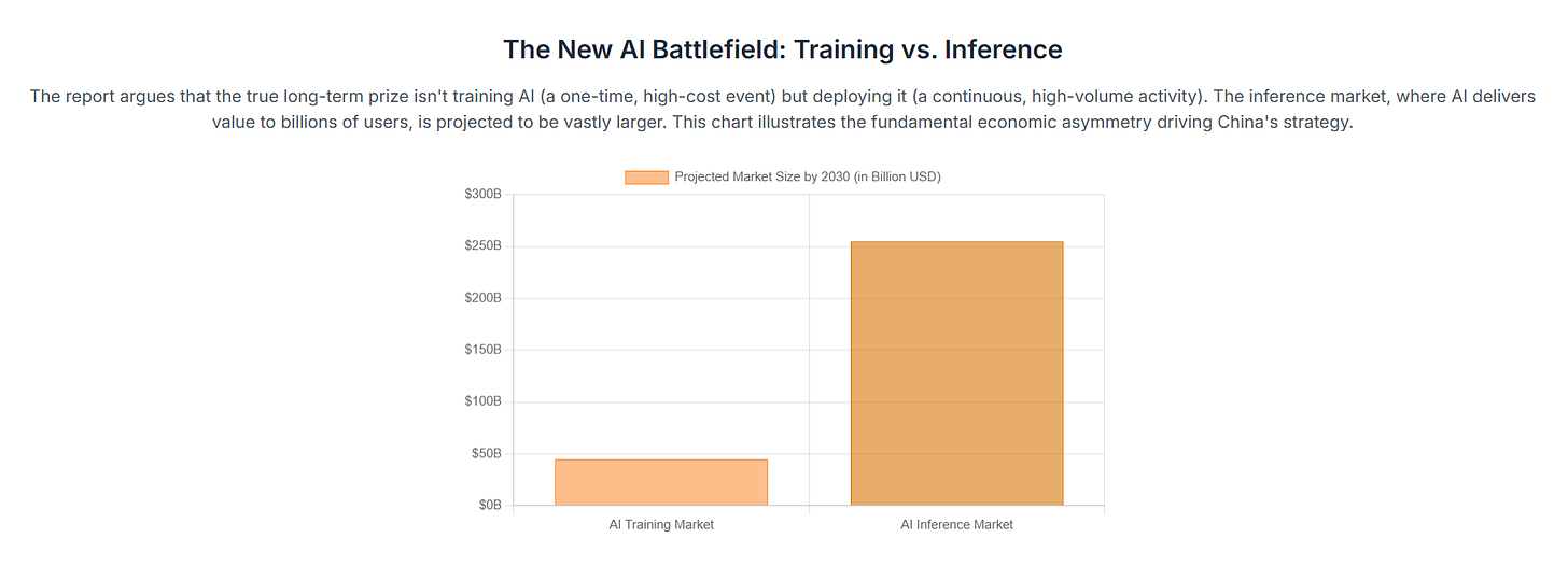 The prevailing narrative of the AI competition has been dominated by a training-centric worldview: the entity capable of building the most powerful models using the most advanced hardware wins the AI race. This perspective explains the intense global focus on Nvidia's latest GPUs, the multi-billion-dollar investments in massive training clusters, and the strategic importance of cutting-edge semiconductor fabrication.4 However, this narrative fundamentally misunderstands the economics of how AI will be consumed globally and overlooks the critical distinction between the creation of AI and its application. China's emerging strategy is built upon a clear-eyed assessment of this distinction, exploiting a fundamental asymmetry between the AI training and inference markets.
