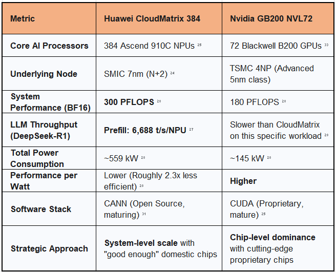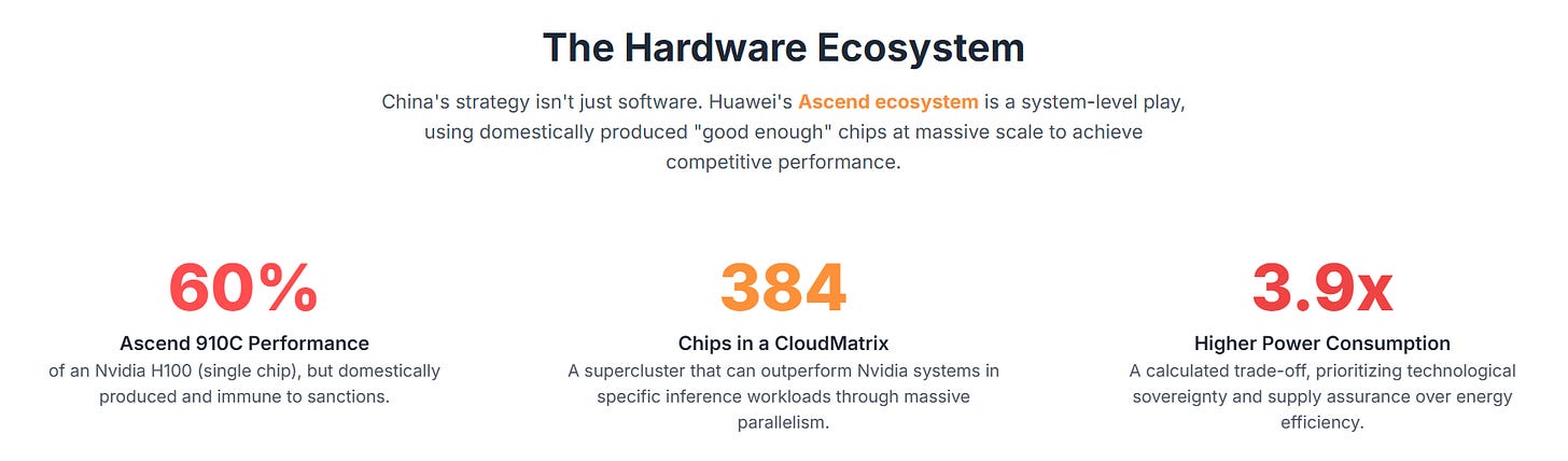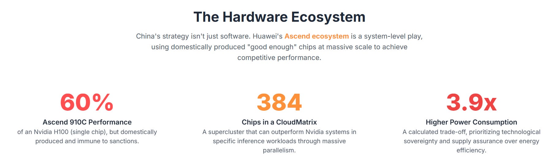 A common analytical error made in the West is to evaluate China's hardware progress through a simple chip-to-chip comparison, where an individual Huawei Ascend processor is benchmarked against its Nvidia counterpart. This approach fundamentally misunderstands China's strategic intent. While a single Huawei Ascend 910C chip delivers approximately 60% of the inference performance of an Nvidia H100, Huawei is not attempting to win a battle of individual chip supremacy.24