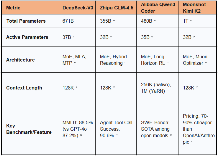 Zhipu AI's GLM-4.5 series further demonstrates the trend toward efficient, application-focused models. Like DeepSeek, it employs an MoE architecture, with the flagship GLM-4.5 featuring 355 billion total parameters and 32 billion active parameters. A more compact variant, GLM-4.5-Air, offers 106 billion total parameters with just 12 billion active, making it suitable for deployment on less powerful hardware.14