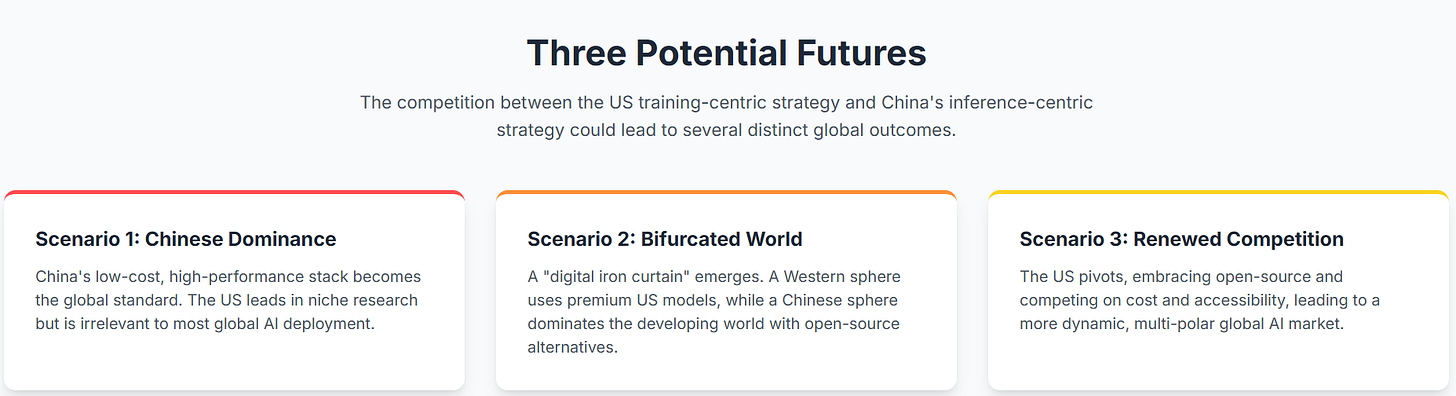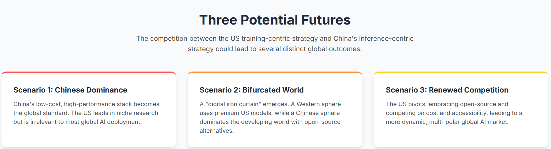 The confluence of China's inference-centric strategy and the current US response creates a strategic inflection point for the future of the global AI ecosystem. The trajectory from this point is not predetermined and could lead to several distinct outcomes, each with profound implications for technological leadership, economic distribution, and geopolitical alignment.