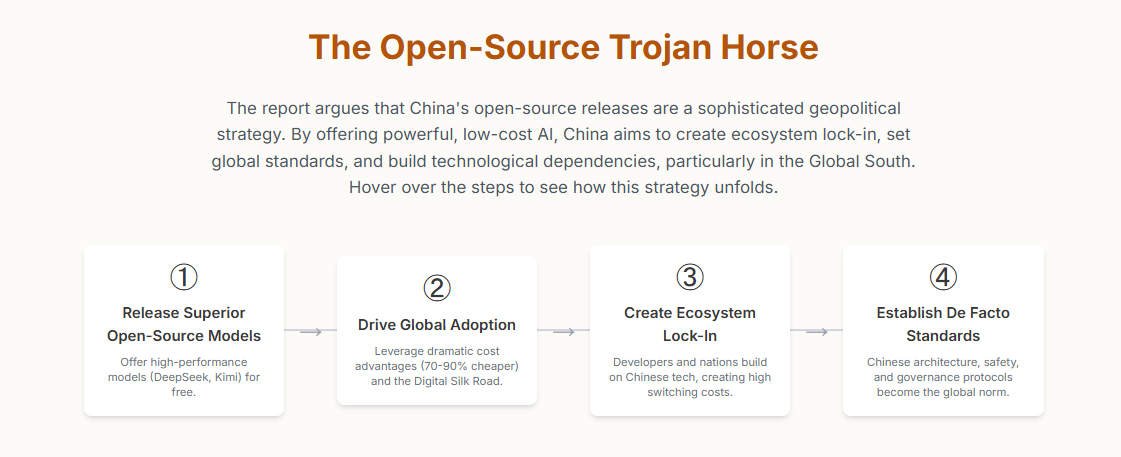 China's inference strategy extends far beyond the technical and economic realms; it is a sophisticated and fully integrated component of its broader geopolitical ambitions. By combining low-cost, high-performance open-source AI models with affordable, domestically produced hardware, China is creating a technological value proposition that is highly attractive to the developing world. This strategy is being executed through established foreign policy frameworks like the Digital Silk Road, with the ultimate goal of establishing Chinese technology as the global standard, building spheres of influence, and creating durable technological dependencies.